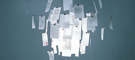 Ingo Maurer creëerde in 1997 met de Zettel'z 5 een klassieker die bijzonder populair is bij creatieve ontwerpers, gevolgd door de Zettel'z 6 in 1998. Een combinatie van bedrukte en blanco vellen Japans papier kan individueel aan de armatuur worden bevestigd - er is genoeg ruimte voor je eigen schetsen en berichten. Twee lampen in het midden van de Zettel'z 5 verlichten het hoogwaardige papier en zorgen voor een aangenaam licht.