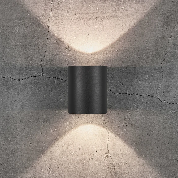 Halfronde Canto 2 Seaside LED buitenwandlamp in duurzaam zwart De Canto 2 Seaside LED buitenwandlamp heeft aan de voorkant de vorm van een cilinder, terwijl de achterkant rechthoekig is. De aluminium behuizing bevat lichtuitgangen aan de boven- en onderkant, die voorzien zijn van heldere glazen afdekkingen. De geïntegreerde LED module straalt warmwit licht naar boven en beneden uit en creëert zo aantrekkelijke accentverlichting en nuttige oriëntatieverlichting langs de gevel of bij de ingang - Ontworpen door het Deense architectenbureau Bønnelycke MDD - Beschermgraad: IP44 - Corrosiebestendige, weerbestendige afwerking; geschikt voor gebruik dicht bij zee - Inclusief LED driver (aan/uit) - Parallelschakeling met meerdere armaturen mogelijk - Meerdere bevestigingen voor de lichtuitgangen inbegrepen om verschillende lichteffecten te creëren