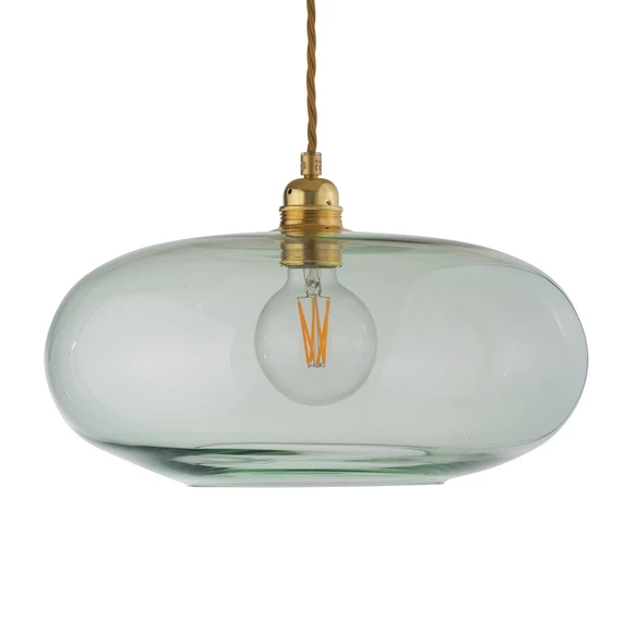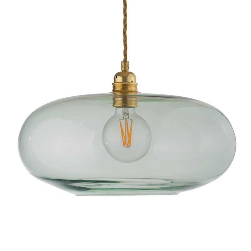 Hanglamp Horizon met handgeblazen glas in elegant groen Oval en plat, dat is het ontwerp van de esthetische kap van de lamp, die als handgeblazen stuk uniek is voor elke lamp. Met haar ontwerp en naturel reflecteert ze de facetten van de natuur op een bijzondere manier en doet ze denken aan de fascinerende uitgestrektheid van de horizon. Het doorschijnende glas in een prachtig subtiele groene kleur houdt het binnenwerk zichtbaar en zorgt voor een magisch lichteffect dat gelijkmatig door de kamer wordt verspreid. Het jonge label EBB & FLOW staat voor decoratieve verlichting en werd in 2009 opgericht door Susanne Nielsen. Zij is verantwoordelijk voor alle ontwerpen, die altijd Mite hebben in Deens-Scandinavische of Britse Stil. De handgeblazen lampen worden in Europa met traditioneel vakmanschap vervaardigd en maken naast hun aantrekkelijke ontwerp ook altijd indruk door hun hoogwaardige afwerking. Die kap is gemaakt van handgeblazen glas. Elke lamp is uniek; door het fabricageproces kunnen er kleine variaties zijn, zoals kleine luchtbellen enz.