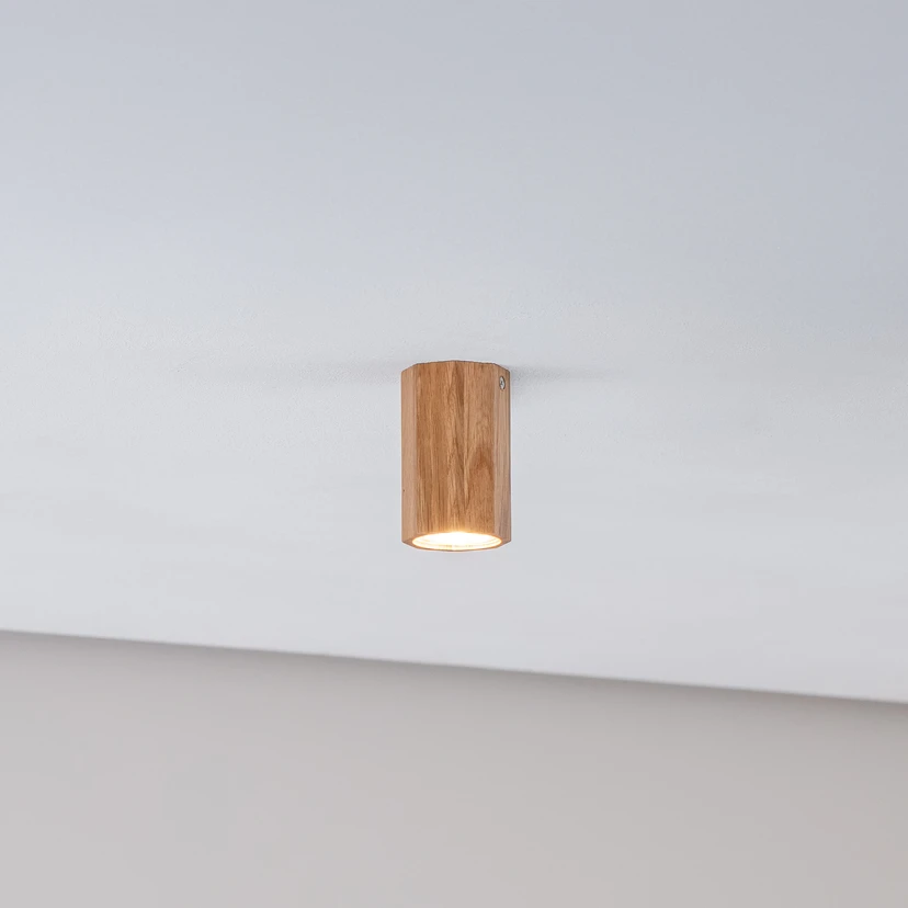 Enkelvoudige Peach Puff plafondlamp van lichtgekleurd hout in een achthoekige vorm De Peach Puff plafondlamp, vervaardigd in Europa, is een flexibel combineerbare downlight met een natuurlijke uitstraling voor droge binnenruimtes. Het langwerpige houten lichaam met een achthoekige basis heeft een ronde opening aan de onderkant, die geschikt is voor een lichtbron met een diameter van 5 cm en een lengte van 5,6 cm.