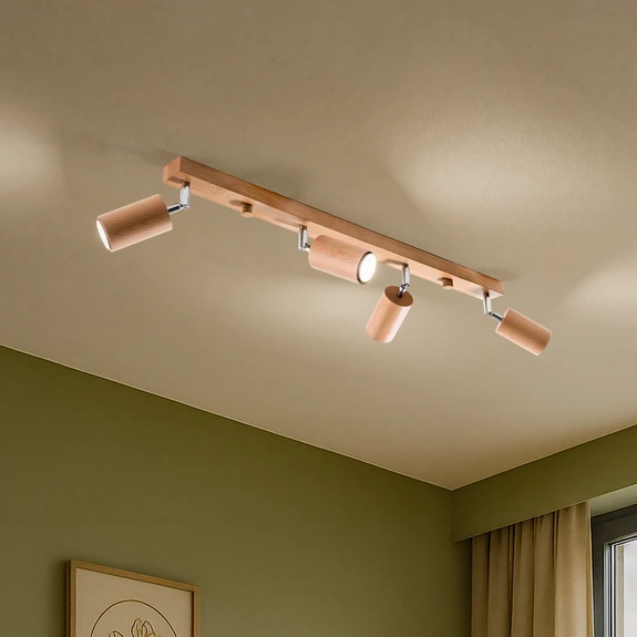 Vierlichts Peach Puff plafondspot van lichtgekleurd hout met cilindrische spots De in Europa geproduceerde Peach Puff plafondspot overtuigt door de natuurlijke uitstraling van het lichtgekleurde hout en de mogelijkheid om het licht naar wens te richten. Dit wordt bereikt dankzij de verstelbare bevestigingen van de vier cilindrische spots, die in een rij onder de rechthoekige kap zijn geplaatst - maximale afmetingen van de te gebruiken lichtbron: Ø 5 cm, lengte 5,6 cm