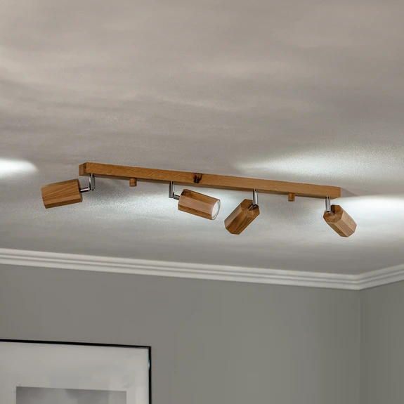 Peach Puff plafondspot met vier lichtpunten van lichtgekleurd hout in een achthoekige vorm De Peach Puff plafondspot van hout en vervaardigd in Europa is een flexibel instelbare lichtbron met een natuurlijke uitstraling voor droge binnenruimtes. De vier langwerpige koppen met een achthoekige basis bevinden zich onder een rechthoekige kap en hebben elk een ronde opening aan de onderkant, waarin een lichtbron van 5 cm Ø en 5,6 cm lang past.