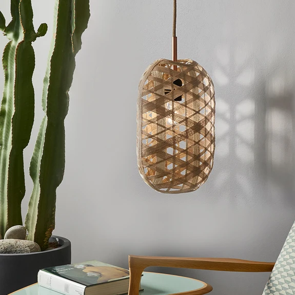 Deze design-hanglamp overtuigt meteen met zijn ovale lampenkap, die aan een textielkabel van dezelfde kleur aan het plafond hangt. De kap wordt gevormd door bananenbladeren en brengt een bijzonder lichtbeeld met indrukwekkende effecten in de ruimte door de lichtpassages. Capsule is met name effectief in woonruimtes en ingangsbereiken. Een geschikte lichtbron wordt in de E27-fitting gestoken. Voor een energie-efficiënte en duurzame verlichting wordt een LED lamp aanbevolen.