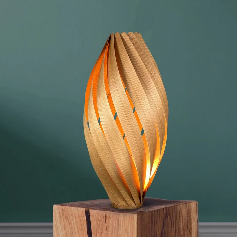 Het bedrijf Gofurnit uit Keulen bestaat sinds 2019 en legt zich toe op de productie van duurzame armaturen. Tot hun kwaliteitsproducten behoort ook de tafellamp Ardere, die deel uitmaakt van een hele reeks tafel- en staande lampen, alsook hanglampen in verschillende afmetingen en verschillende houtsoorten. De fineerstroken zijn samengevoegd tot een rechtopstaande kap, die in hoogte en dus ook in lichtopbrengst met enkele centimeters kan worden versteld door met de handpalm lichtjes op de bovenkant te drukken. Door naar beneden te drukken wordt de lichtuitlaat groter en het aanzicht van de armatuur iets ovaler. Zodra het rolgordijn met de hand weer omhoog wordt getrokken, wordt het hoger en smaller en wordt de lichtuitlaat kleiner. Het licht wordt indirect en niet-verblindend uitgestraald.