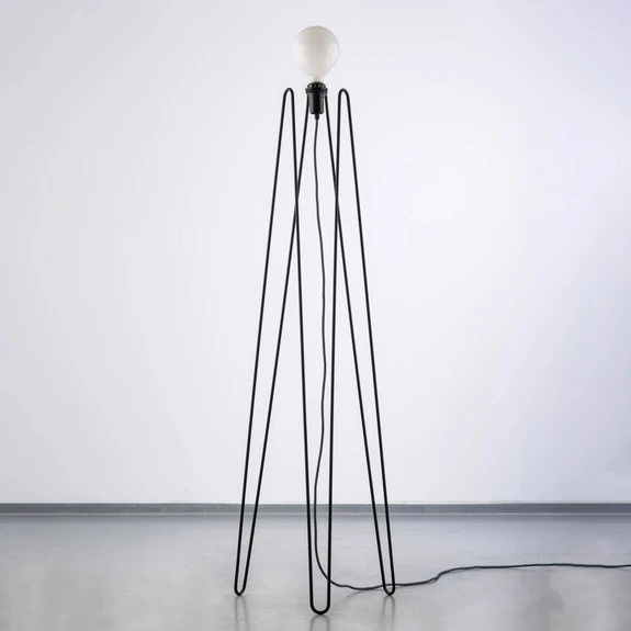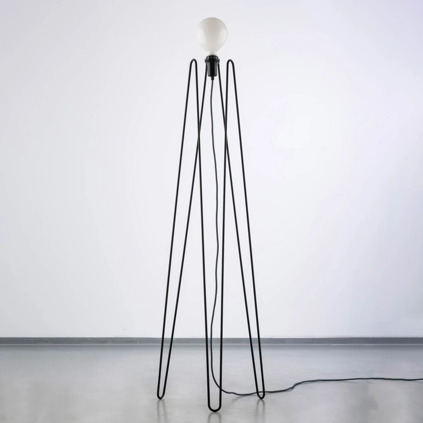 LED vloerlamp Model M2 met filigraan stalen frame en kap van opaalglas in grote bolvorm De LED vloerlamp Model M2 van de Kroatische fabrikant GRUPA heeft een organische, futuristische en uiterst elegante uitstraling met haar filigrane, handgemaakte stalen frame. De M2 versie maakt gebruik van een enkele stut die meerdere keren is gebogen aan de boven- en onderkant, wat resulteert in een totaal van zes secties. Deze raken de vloer op drie punten en dienen als voeten. Naast het speciale frame wordt de Model serie gekenmerkt door de kap van opaalglas in de vorm van een oversized gloeilamp. De kleine kop heeft een ingang voor de kabel aan de onderkant, een externe schroefdraad voor de bevestigingsring van de kap en een interne fitting E27. In deze laatste wordt de bijgeleverde adapter geschroefd, die ook plaats biedt aan de meegeleverde LED lamp E14 aan de binnenkant. Met zijn warmwitte licht verandert de glazen kap in een stralende bol rondom - Aan/uit-schakelaar op de kop - Made in Europe