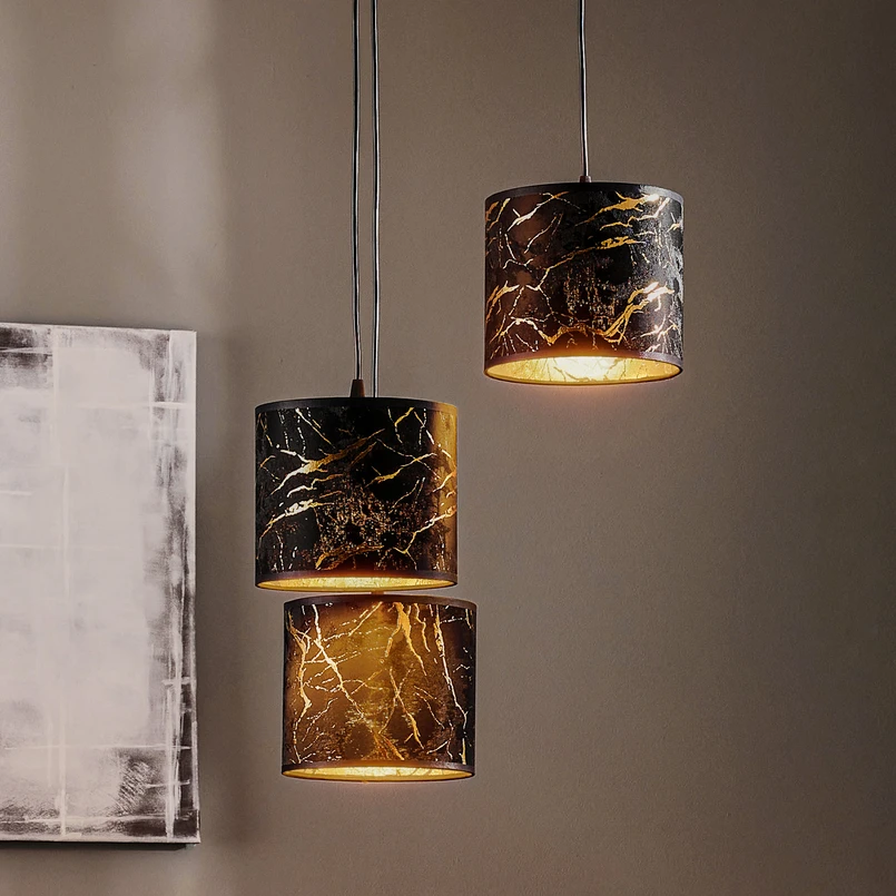 De hanglamp Jari stof 3-lamps rond zwart gemarmerd combineert een stijlvol design met een hoogwaardige afwerking. De lamp is gemaakt van een combinatie van stof en staal en straalt een tijdloze elegantie uit die zowel in de woonkamer als in de eetkamer accenten legt. De zwart-gouden kleurstelling geeft elke ruimte een luxe uitstraling en zorgt voor een warme, uitnodigende sfeer.