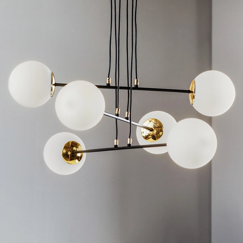 De hanglamp Ognis 6 maakt indruk met zijn moderne design en de combinatie van zwart, wit en goudkleurig metaal en glas. Met zijn zes lichtbronnen biedt hij een indrukwekkende verlichtingsoplossing voor woon-, slaap- en eetkamers. De lamp past naadloos in moderne interieurstijlen en zorgt voor stijlvolle accenten die elke ruimte opwaarderen.