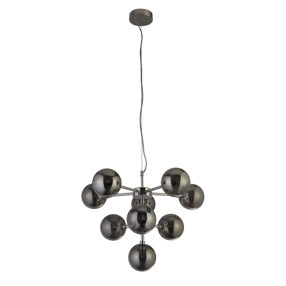 De hanglamp Zarath van rookgrijs glas en rivierstaal overtuigt door zijn moderne design. Met zijn negen vlammen zorgt hij voor een gelijkmatige en indrukwekkende verlichting in woon- en eetkamers. De combinatie van rookgrijs glas en de accenten in zwart en chroom geven elke ruimte een stijlvolle en eigentijdse sfeer.