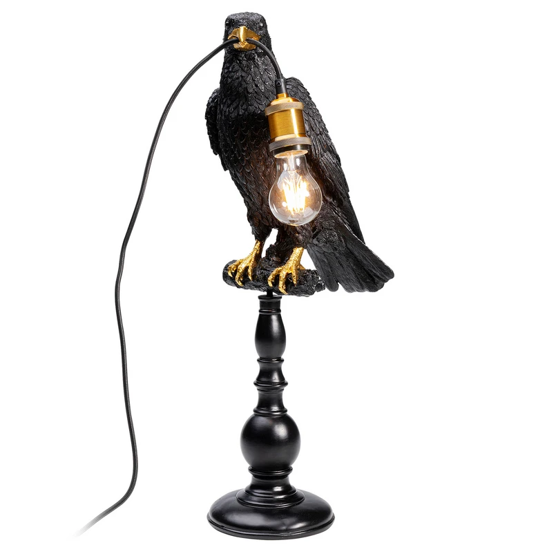 Animal Sitting Crow tafellamp in het design van een kraai De Animal Sitting Crow tafellamp is gemaakt van zwart kunststeen en zit op een gedraaide voet, die het snoer en de E27 fitting in zijn snavel vasthoudt. Op een plank, vensterbank of ladekast - deze ongewone tafellamp is een interessante HighLight als hij uit staat. Een heldere lamp met gloeidraadtechnologie ziet er bijzonder decoratief uit in de gouden fitting. De lamp is uitgerust met een schakelaar in de voedingskabel.