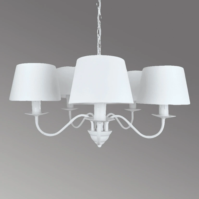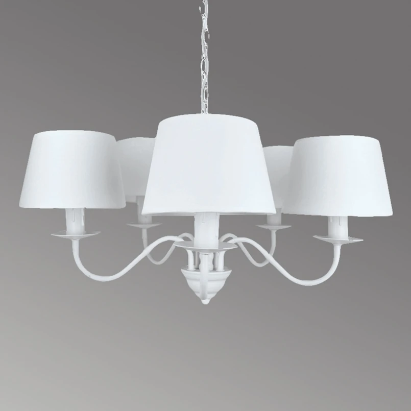 Helemaal in het wit: klassieke kroonluchter Reanna met kleine kapjes De vijf lichtpunten van kroonluchter Reanna zijn voorzien van witte, taps toelopende kapjes die het licht een beetje afschermen zodat het niet verblindt. Het frame is ook wit en heeft een zeer klassieke vorm. Reanna is de perfecte verlichtingsoplossing boven een eet- of keukentafel waar goed algemeen licht nodig is.