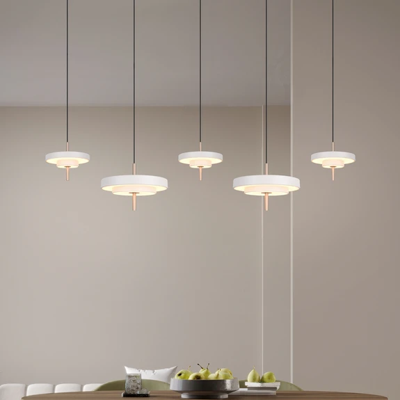 Modern, puristisch en tegelijkertijd heerlijk onopvallend: de 5-lamps hanglamp Keaton overtuigt met een verfijnd ontwerp dat doet denken aan zacht gloeiende schijven die stijlvol over elkaar heen liggen. De minimalistische look wordt nog eens extra benadrukt door de zachte tinten – een echt stijlstatement voor woon- of eetruimtes. De lamp heeft vijf lichtbronnen die zorgen voor een gelijkmatige, aangenaam diffuse verlichting. Ook technisch heeft Keaton veel te bieden: via een praktische DIP-schakelaar direct op de lamp kan de lichtkleur worden gekozen. Ook de helderheid kan individueel worden aangepast – heel eenvoudig in drie stappen via de conventionele wandschakelaar.