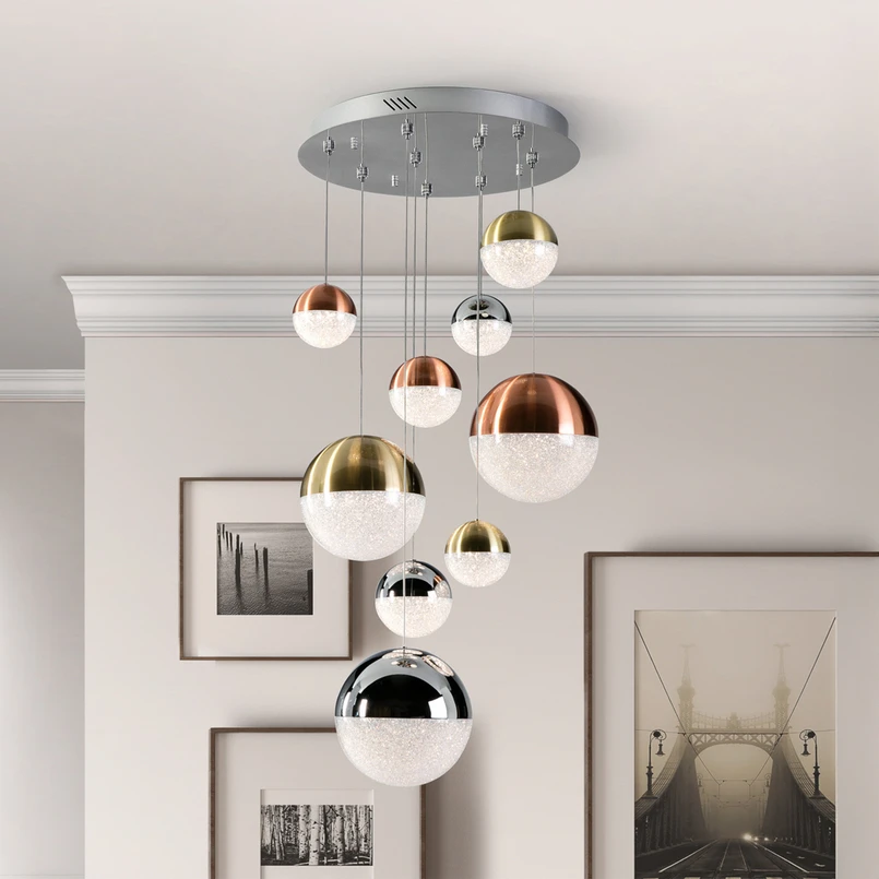 Sphere LED hanglamp in 9-lamps uitvoering, driekleurige kappen De Sphere LED hanglamp combineert verfijnd design met functionele verlichting. De lamp is gemaakt van hoogwaardig metaal en polycarbonaat en biedt een indrukwekkende kleurencombinatie dankzij de bolvormige kappen, die niet alleen verschillende groottes hebben maar ook gemaakt zijn van metaal in koper, goud en chroom aan de bovenkant. Dit armatuur is ideaal voor de woonkamer en creëert een uitnodigende sfeer met zijn warmwit licht. De geïntegreerde LED lamp zorgt voor energiebesparend licht en een lange levensduur. Een bijzonder kenmerk van het armatuur is de dimbaarheid, die mogelijk is via een externe dimmer (triac of 0-10 V). Er wordt ook een dimset meegeleverd die kan worden geïnstalleerd als alternatieve vorm van dimmen.