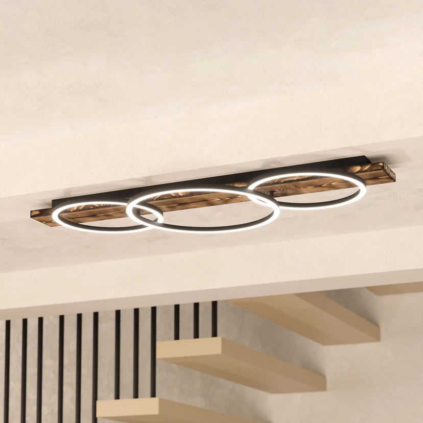 3-lamps Boyal LED plafondlamp voor stijlvolle accenten De Boyal LED plafondlamp maakt niet alleen indruk met haar elegante zwarte ontwerp en warme houten look, maar ook met haar vermogen om sfeer te creëren. Met drie lichtbronnen biedt de Boyal plafondlamp evenwichtige verlichting voor de woonkamer, eetkamer en keuken. De energiebesparende LED-technologie zorgt voor een efficiënte verlichting van de kamers en draagt bij aan een aangename sfeer.