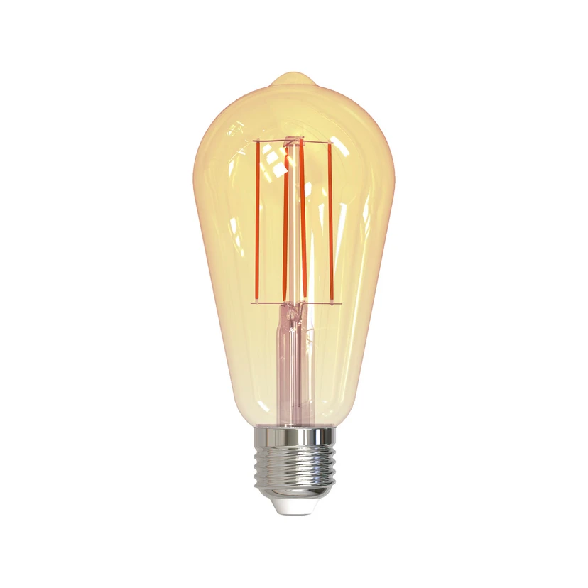 Dimbare, decoratieve LED rustiek lamp E27 7W, goudkleurig De mooie LED rustiek lamp in de vorm van een gloeilamp is een echte blikvanger, brengt het gloeilampgevoel terug en is daarom perfect voor vintage en sfeerverlichting. Met zijn goudkleurige getinte glas voegt de lamp een vleugje warmte toe aan elke kamer, wat nog wordt versterkt door de extra warmwit lichtkleur van 2.000 Kelvin - een feel-good factor gegarandeerd. Maar het is niet alleen het ontwerp dat de Rustika een geweldige investering maakt, want de lamp is zeer energiezuinig en straalt licht uit met een stralingshoek van 320°, waardoor de kamer volledig verlicht wordt. Kenmerken: - bespaart een aanzienlijke hoeveelheid energie - gouden retro LED lamp met innovatieve filament technologie - dimbaar - zeer warmwit licht voor een bijzonder gezellige sfeer - hoge kleurweergave voor schitterende kleuren - vervangt standaard E27 lampen tot 51 watt