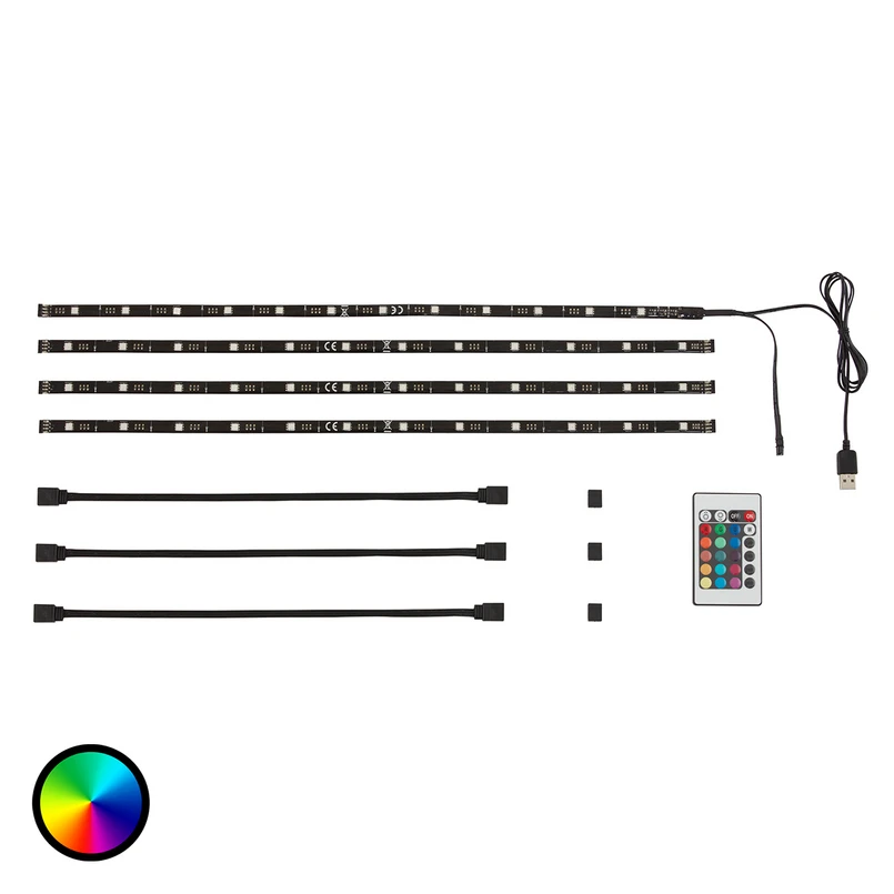 Praktische LED strip LED ALS TV voor sfeervolle achtergrondverlichting van tv's De USB LED strip LED ALS TV is Ideal voor achtergrondverlichting van tv's. De Set bevat vier LED strip van elk 50 cm lang. Deze zijn gemaakt van zwart plastic waarin individuele LED's zijn ingebed. Die hebben samen een totale lengte van twee meter, wat betekent dat alle standaard schermformaten kunnen worden gemonteerd. Die set bevat ook: - een afstandsbediening - USB-aansluiting - drie connectoren en bijbehorende aansluitkabels De LED strips kunnen om hoeken worden gemonteerd met behulp van de meegeleverde aansluitkabels. Das wordt bevestigd met de zelfklevende achterkant van de strips. Die Gross-kleurselectie via de afstandsbediening biedt ook een kleurwisselfunctie en elke individuele kleur kan ook worden gedimd. De Set kan worden gebruikt om gezellige indirecte verlichting te creëren rond de TV of het computerscherm.