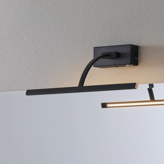 Dimbare LED wandlamp Matisse met beweegbare arm Die Modieuze en tijdloze LED wandlamp Matisse is Ideal voor het verlichten van schilderijen of spiegels. De uitstekende arm, waaraan een langwerpige, smalle armatuurkop is bevestigd, kan omhoog en omlaag worden bewogen. Hierdoor kan niet alleen de hoogte maar ook de richting van de lichtstraal eenvoudig worden aangepast. Das licht wordt direct uitgestraald over de hele lengte en schijnt in een warmwitte kleur. In de hoekige muurbeugel is een schakelaar geïntegreerd. Hiermee kan het licht worden in- of uitgeschakeld. Het heeft ook een dimmer die de laatst gekozen instelling onthoudt dankzij de geheugenfunctie.