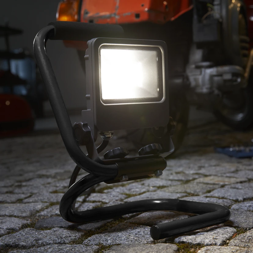Worklight S-Stand LED bouwspot met draaibare lampenkop De Worklight S-Stand LED werklamp is een krachtige bouwspot met universeel witte LED's. Ideaal voor verlichting tijdens renovaties en bouwwerkzaamheden of als lichtbron in garages en werkplaatsen. De werklamp kan worden aangesloten en flexibel worden verplaatst met de kabel van 2 meter. Verdere flexibiliteit wordt geboden door de draaibare lampenkop, waarmee de lichtbundel naar wens kan worden gericht. De gedeeltelijk matte afdekking van gehard glas zorgt voor een gelijkmatige verdeling van het licht. De donkergrijze aluminium behuizing is stofdicht dankzij de beschermingsgraad IP65 en is zelfs beschermd tegen zware regenval, zodat de schijnwerper zonder problemen buiten kan worden gebruikt. De nieuwe LEDVANCE producten, voorheen bekend onder de merknaam OSRAM, combineren de hoogste kwaliteitsnormen met modern design - Energiebesparingen tot 80% mogelijk in vergelijking met het gebruik van halogeenlampen
