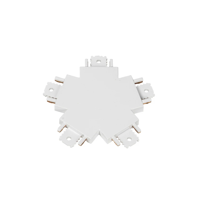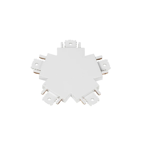 Witte kunststof Lumaro connector met vijf aansluitpunten Deze connector kan componenten van het Lumaro railsysteem combineren. Let op: het Lumaro railsysteem is alleen compatibel met accessoires uit de Lumaro serie. Combineer om verwarring met andere systemen te voorkomen alleen accessoires en railsystemen uit de gelijknamige serie.
