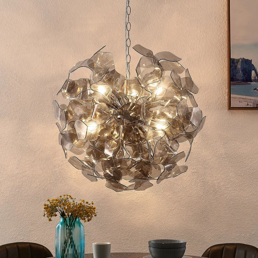 Deze pendelarmatuur bekoort met een individueel ontworpen lampenkap van rookgrijze acrylelementen. Deze omringen de brandende punten die eronder verborgen zijn, zodat de lampenkap het totaalbeeld van een bol creëert.