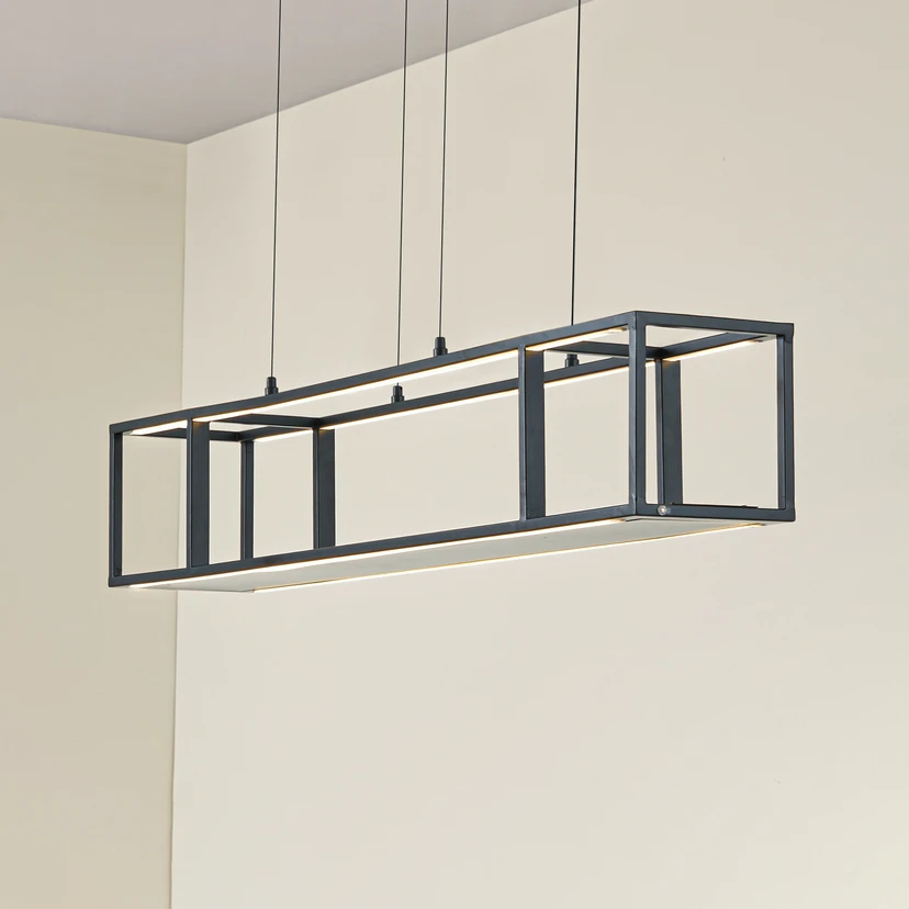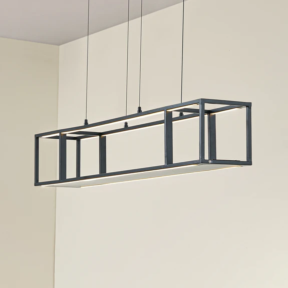 De LED hanglamp Estante combineert een modern design met functionele verlichting. De lamp is gemaakt van metaal en PVC en past naadloos in verschillende woonomgevingen, zoals de woonkamer en eetkamer. De donkere kleur maakt hem tot een blikvanger in elke ruimte.