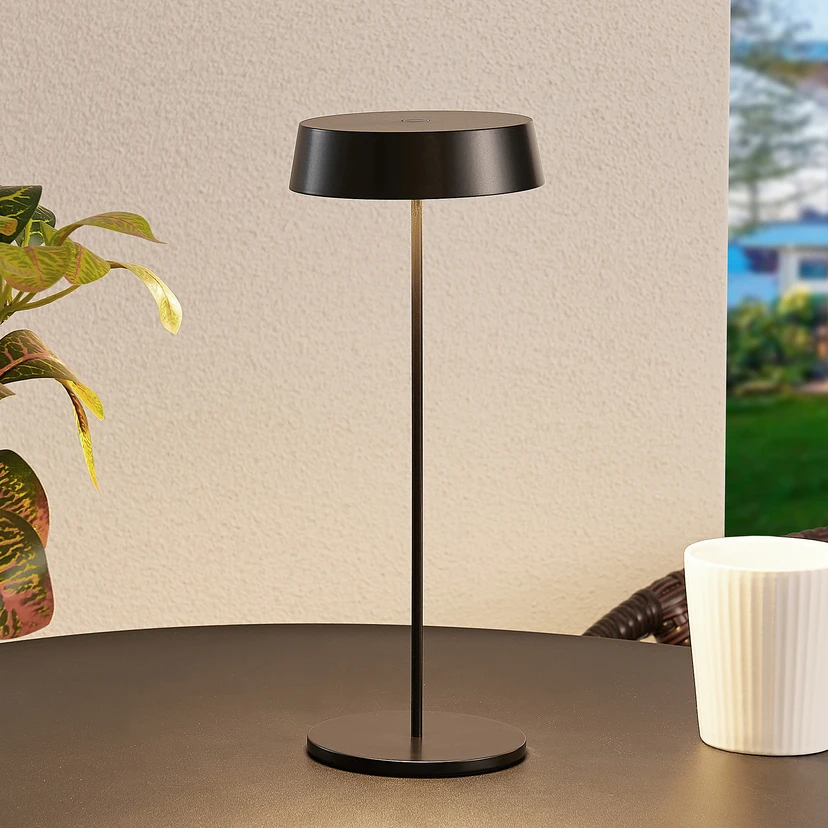 Zwarte LED tafellamp Tibia met oplaadfunctie, IP54 De LED tafellamp Tibia heeft een chique ontwerp en beschikt ook over geweldige technische functies. Hij is volledig gemaakt van gegoten aluminium met een modieuze zwarte afwerking. De platte kap heeft een eigentijdse look en zorgt ervoor dat het licht naar beneden wordt uitgestraald zonder te verblinden. Dit armatuur heeft een geïntegreerde touchdim-functie waarmee het licht traploos kan worden gedimd. Het heeft ook een geïntegreerde oplaadbare batterij die kan worden opgeladen met een USB-kabel. Dit maakt het mogelijk om het armatuur volledig onafhankelijk van het lichtnet te gebruiken en op te stellen waar het nodig is. De beschermingsgraad IP54 maakt zelfs gebruik buitenshuis mogelijk.