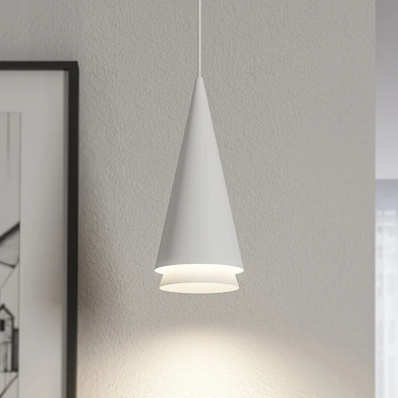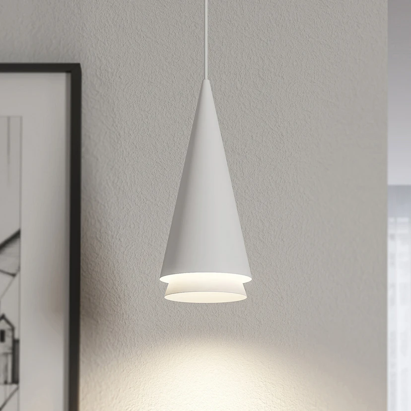 Naoh heeft een onaangetast kleurenschema, helemaal in het wit, dat natuurlijk en discreet overkomt. Een overtuigend modern design in tweelagige vorm kenmerkt de vormentaal, waarbij de lampenkap van metaal op een kegel lijkt en het licht vooral naar beneden uitstraalt. Zo is de hanglamp zeer goed geschikt als tafel- of toonbankverlichting en kan zij met meerdere lampen in een rij worden gemonteerd. De armatuur aan het plafond is ook kegelvormig en weerspiegelt dus tot op zekere hoogte de lampenkap, zij het in iets kleinere afmetingen. Het tweelagige ontwerp individualiseert het ontwerp en de gloeilampen zijn bijpassende lampen die ook visueel goed bij Naoh passen.