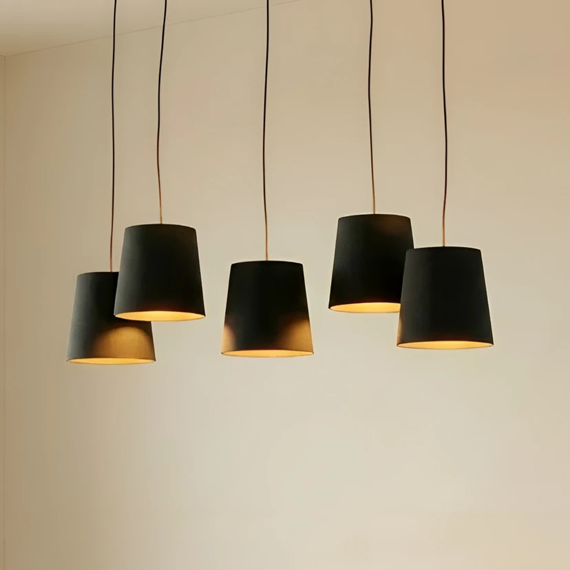 Thamila 5-lamps hanglamp van stof met zwarte kappen Thamila is een zeer aantrekkelijke hanglamp van stof die in veel ruimtes van de woonkamer haar plaats zal vinden. Ze is uitgerust met vijf zwarte kappen en geeft een heel gezellig licht dat uitnodigt om je goed te voelen. Dit is een echte aanwinst in de eetkamer of woonkamer, vooral omdat het licht zacht wordt gedimd door de zwarte tint van de kappen en alleen het volle licht naar beneden ontsnapt, zodat het tafelblad of aanrecht goed en helder kan worden verlicht. De plafondhouder bestaat uit gekruiste stijlen en de kappen hangen daardoor een beetje scheef, wat zeer bevorderlijk is voor de uitstraling.