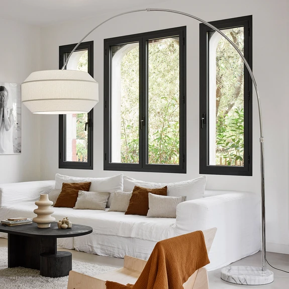 Elegante lichtbron met een interessante mix van materialen - Cosiness boogvloerlampMet de Cosiness vloerlamp experimenteert het Franse designlabel Market Set met een combinatie van verschillende elementen. Cosiness is ontworpen in de vorm van een klassieke booglamp. De ronde, elegante voet is gemaakt van licht marmer en draagt een hoog, gebogen metalen frame, dat er modern uitziet door zijn chromen afwerking en waarmee zowel de hoogte als de projectie kan worden aangepast. De kap van wit katoenen bouclétextiel, die in het midden cilindrisch en aan de boven- en onderkant taps toeloopt, is gezellig en huiselijk.