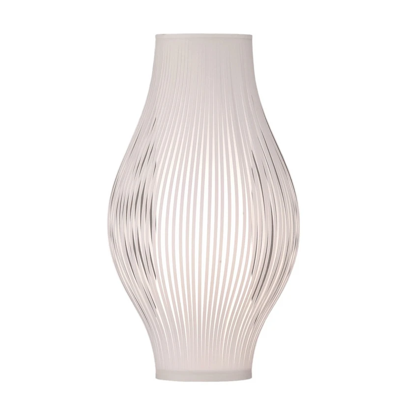 Murta tafellamp van textiel Murta is een blikvanger in elke kamer, omdat hij volledig bestaat uit witte textielstroken die een harmonieus licht doorlaten. De textielstroken worden boven en onder vastgehouden en lopen verticaal in een boogvorm. De acrylzuil omringd door de kap bevat een E27 fitting die kan worden uitgerust met een lamp naar keuze. Het gebruik van energiezuinige lampen wordt aanbevolen om een permanent laag verbruik te garanderen.