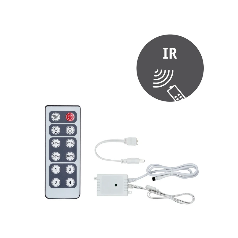 Met de bijgeleverde infrarood afstandsbediening kunnen monochrome LED-strips worden geschakeld en gedimd zolang er zichtbaar contact is tussen de afstandsbediening en de ontvanger. De gewenste instellingen kunnen in vier geheugenplaatsen worden opgeslagen.