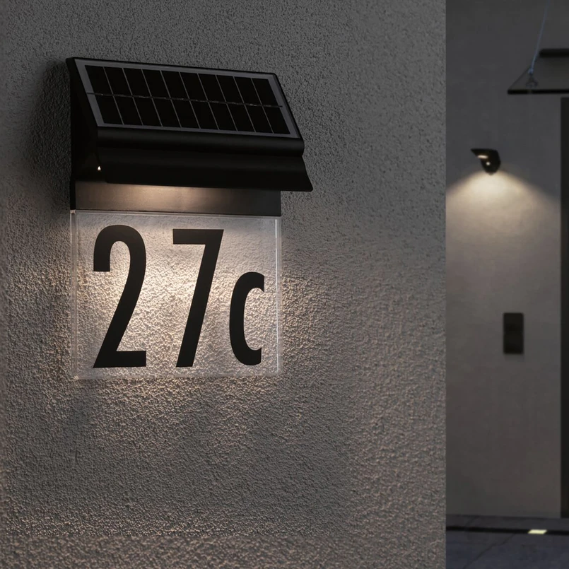 De LED huisnummerlamp Neda op zonne-energie doet het zonder stroomaansluiting en wijst bezoekers, post- of pakketdiensten de weg. De lamp wordt geleverd met een etikettenset van cijfers en letters die op het transparante plastic oppervlak zijn geplakt.