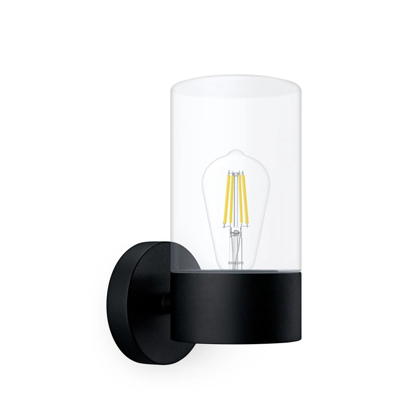 Zwart gelakte Flareon buitenwandlamp met heldere gasfles Het heldere, eenvoudige ontwerp van de Flareon wandlamp, die dankzij de spatbescherming geschikt is voor gebruik in alle buitenruimtes, past bij veel geveldesigns. Het licht van de gebruikte lamp wordt in alle richtingen uitgestraald en zorgt voor een heldere en veilige basisverlichting - kwaliteitsproduct van Philips