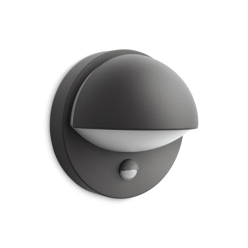 De LED buiten wandlamp June met zijn mooie vorm straalt zijn warmwitte licht door de halfronde metalen schaal aan de bovenkant en de naar beneden gewelfde diffuser uitsluitend in een breed gebied naar beneden en schakelt dankzij de geïntegreerde bewegingsmelder automatisch in wanneer er licht nodig is.