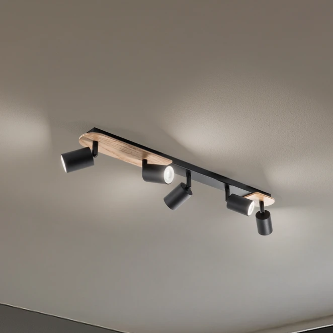 De plafondspot Cover Wood, 5-lamps, combineert de natuurlijke esthetiek van hout met de robuustheid van staal en creëert zo een harmonieuze verlichtingsoplossing voor woonkamers en gangen. De combinatie van licht hout en een zwarte afwerking geeft het ontwerp een tijdloze elegantie die naadloos past in verschillende interieurstijlen.
