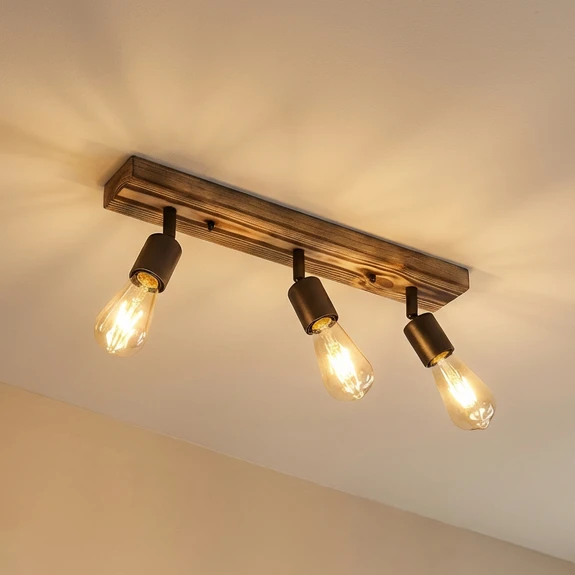 De plafondspot Duarte combineert een stijlvol design met functionele verlichting en is de ideale keuze voor moderne woonruimtes. De spot is gemaakt van hoogwaardig grenenhout en robuust metaal en heeft een aantrekkelijke combinatie van houtkleurige en zwarte elementen. Deze materiaalkeuze geeft de ruimte een warme en tegelijkertijd elegante sfeer. De 3-lamps constructie zorgt voor een gelijkmatige verlichting, die zowel in de woonkamer als in de hal optimaal tot zijn recht komt.