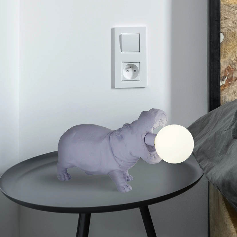 Tafellamp X Hippo in de vorm van een nijlpaard Met haar speelse ontwerp creëert tafellamp X Hippo een betoverende sfeer in de woonruimte en voegt ze een grillig element toe aan het interieur. Deze lamp is natuurlijk ook perfect voor gebruik in kinderkamers. Terwijl de figuur in de vorm van een nijlpaard gemaakt is van kunsthars, is de bolvormige kap gemaakt van opaalwit glas, wat zorgt voor een verblindingsarme verlichting. In de kabel is een schakelaar (aan/uit) geïntegreerd. Voor een vrij te kiezen G9 lamp met een maximum van 3 watt (niet inbegrepen, zie accessoires).