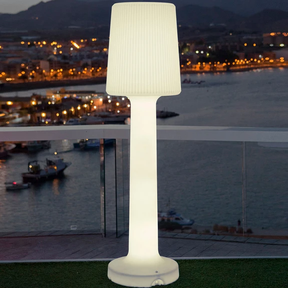 Vloerlamp Carmen voor binnen en buiten met gegroefde kap Die vloerlamp Carmen is volledig gemaakt van UV-bestendig en robuust polyethyleen, waardoor hij geschikt is voor zowel Innes als buiten (beschermingsgraad IP65). De lamp met haar slanke voet krijgt een bijzonder geraffineerd accent door de gegroefde kap, waardoor ze visueel afsteekt tegen het frame. Die wordt geleverd met een G13 lamp in de vorm van een LED lamp. Deze verlicht het hele armatuur en het doorschijnende materiaal laat het licht gelijkmatig rondom uitstralen. Carmen is een veelzijdig armatuur dat op verschillende manieren kan worden geplaatst voor privé buitenruimtes of voor buitenruimtes van horecagelegenheden, en het armatuur creëert ook een stralend accent binnenshuis, bijvoorbeeld in een hotellobby of spa.