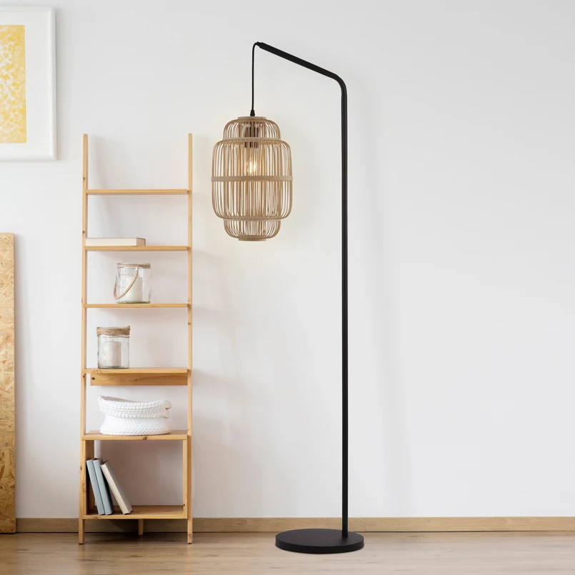X Java vloerlamp met kooivormige bamboe kap Die X Java vloerlamp spot rustieke elegantie met zijn natuurlijke bamboe kap in kooistijl en combineert naadloos traditionele en Mod. Gemaakt van staal in gestroomlijnd zwart en bamboe, voegt ze een vleugje verfijning toe aan elke kamer. Voor een vrij selecteerbare E27 lamp (niet inbegrepen, zie accessoires). Een voetschakelaar (aan/uit) is geïntegreerd in het snoer van de stekker.
